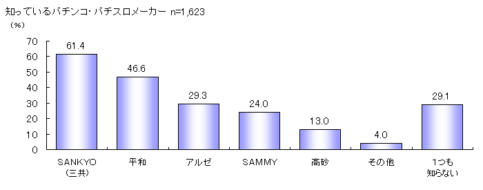 ●最も認知率の高いパチンコ・パチスロメーカーは「SANKYO」で61%。2位「平和」(47%)、3位「アルゼ」(29%)の順である。